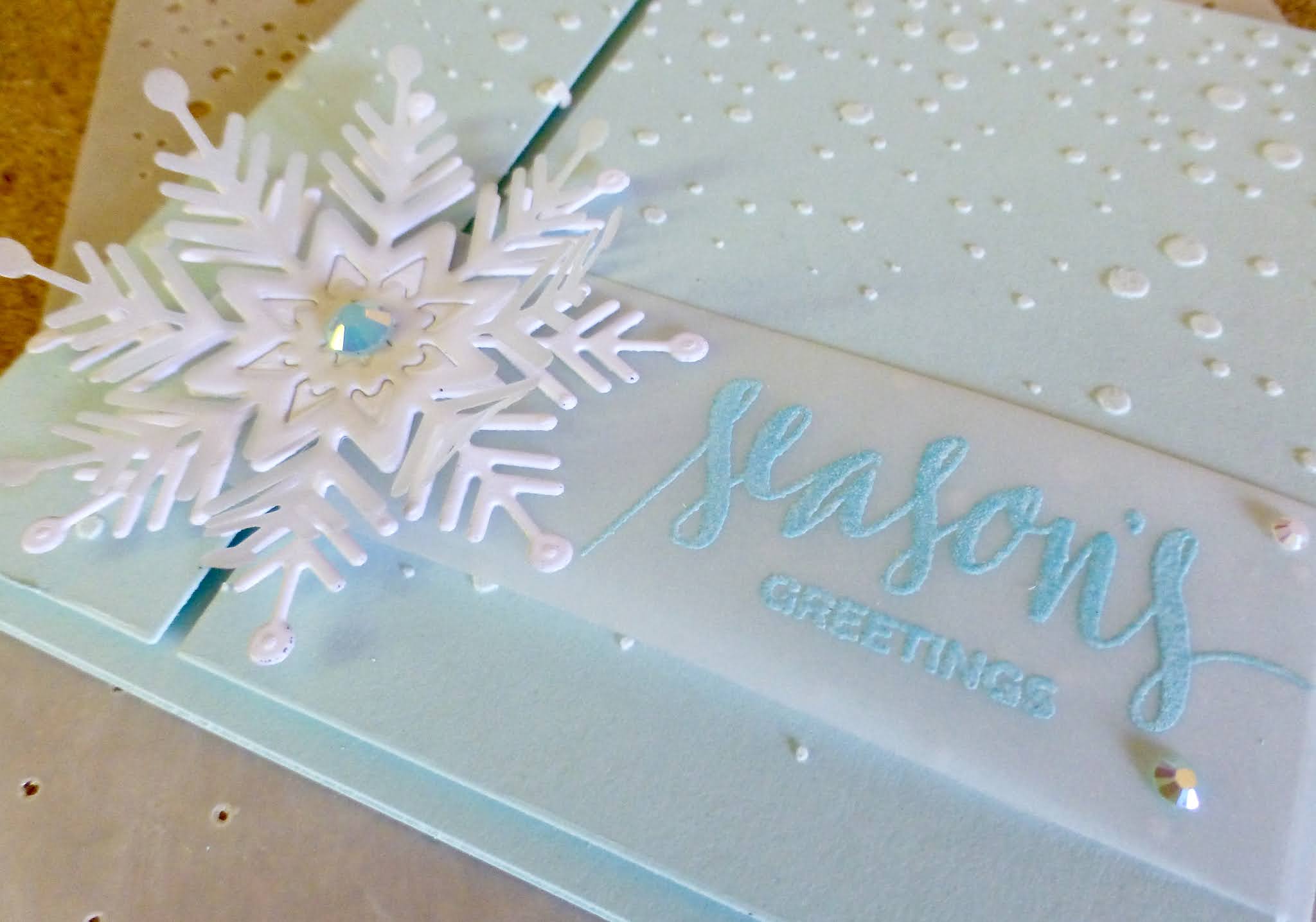 The aqua and gray squares were die cut and adhered in their grid with washi tape to keep the edges clean as Tim Holtz Distress Snowfall Grit Paste was applied with a Taylored Expressions Breezy Stencil. While it dried to a translucent, frosty finish the Poppystamps Birthday Blowout sentiment was heated embossed in Liquid Platinum onto a oval piece of vellum.