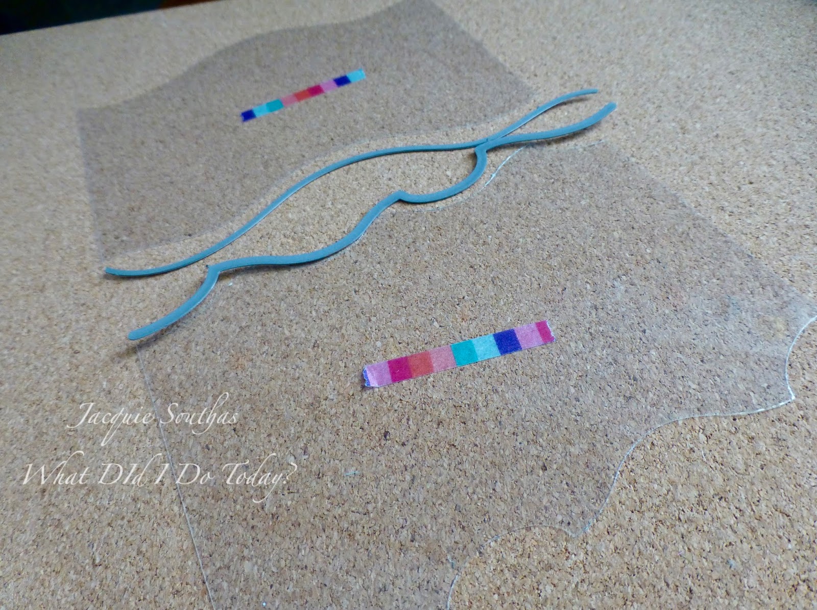 To make my waves, I cut a couple of stencils using border dies and a transparency. The border is cut on both the right side and wrong side of each transparency to double the lines I have to work with. From past experience I've learned to put a piece of washi on one side so I don't accidentally smudge ink over my panel as I flipped from one cut edge to the other.